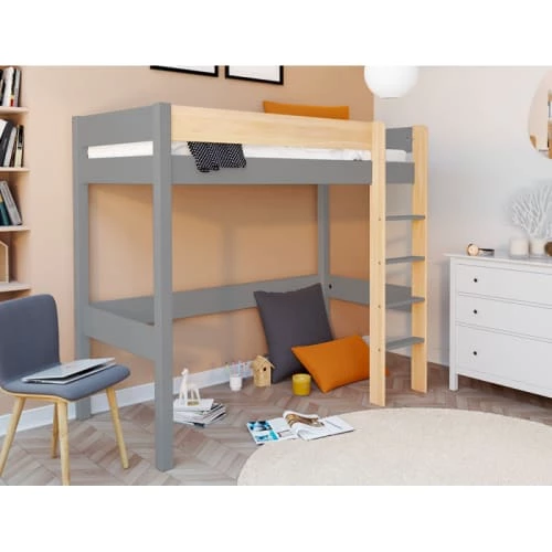 Selon la déco de la chambre de votre enfant, vous pouvez opter pour un lit mezzanine blanc & bois, gris & bois ou kaki & bois. Le lit enfant est peint à l’aide de peinture à l’eau sans solvant. / Livré sans matelas.